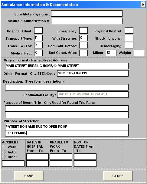 Below is the ambulance certificate, which is accessed through the ADD INFO button on the Charge Entry screen. The ambulance certificate is completed for each run, and can be automated for dialysis runs that require the same information run after run. It is also possible to create hot-keys for the origin and destination fields that greatly speed up the entry of information in this window. Once you have completed both the Charge Entry and Additional information windows, the run is saved and will either file electronically or print to a paper claim. The Ambulance Manager generates ANSI 5010 A1 compliant electronic claims that include all of the ambulance specific data. This increases collections by eliminating many of the requests for additional information.